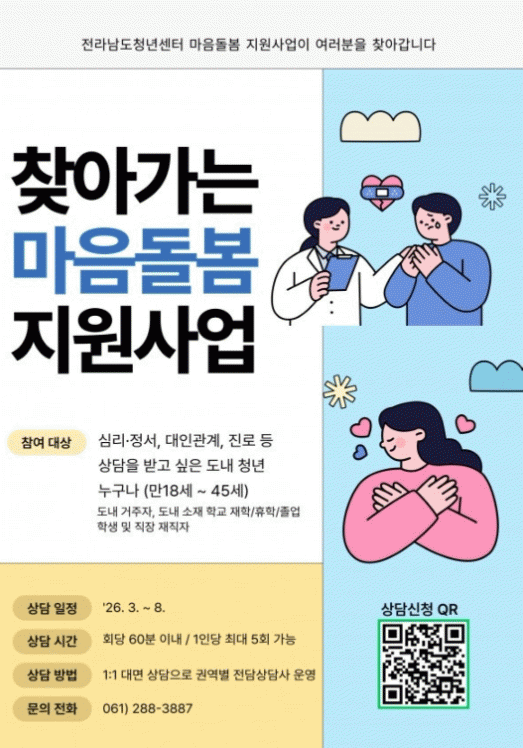 [´º½ºÅë ±è±¤¿ ±âÀÚ] Àü¶ó³²µµ°¡ Áö¿ª û³âÀÇ ½É¸®Àû¡¤Á¤¼Àû ¾ÈÁ¤°ú °Ç°ÇÑ »çȸÂü¿©¸¦ Áö¿øÇϱâ À§ÇØ ¡®2026³â û³â ¸¶À½Ä¡À¯ ÇÁ·Î±×·¥¡¯À» ½Ã¹ü ÃßÁøÇÑ´Ù.