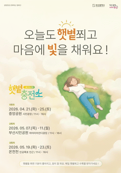 [´º½ºÅë °û¸íÈÆ ±âÀÚ] ºÎ»ê½Ã´Â ¿À´Ã(21ÀÏ)ºÎÅÍ 5¿ù±îÁö 3Â÷·Ê¿¡ °ÉÃÄ ½Ã¹ÎÀÇ ¸¶À½°Ç° ÁõÁø°ú »ý¸íÁ¸Áß ¹®È È®»êÀ» À§ÇÑ Âü¿©Çü Ä·ÆäÀÎ 'ÇÞºµÃæÀü¼Ò - ³ª¸¦ Ű¿ì´Â ÇÏ·ç'¸¦ ¿î¿µÇÑ´Ù°í ¹àÇû´Ù.
