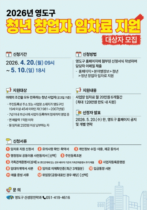 [´º½ºÅë °û¸íÈÆ ±âÀÚ]ºÎ»ê ¿µµµ±¸´Â û³â â¾÷°¡µéÀÇ °æÁ¦Àû ºÎ´ãÀ» ´ú¾îÁÖ°í Áö¿ª ³» ¾ÈÁ¤ÀûÀÎ »ç¾÷ ±â¹Ý ¸¶·ÃÀ» µ½±â À§ÇØ Áö³ÇØ¿¡ À̾î '2026³â û³â â¾÷ÀÚ ÀÓÂ÷·á Áö¿ø»ç¾÷' Âü¿©ÀÚ¸¦ ¸ðÁýÇÑ´Ù°í ¹àÇû´Ù.