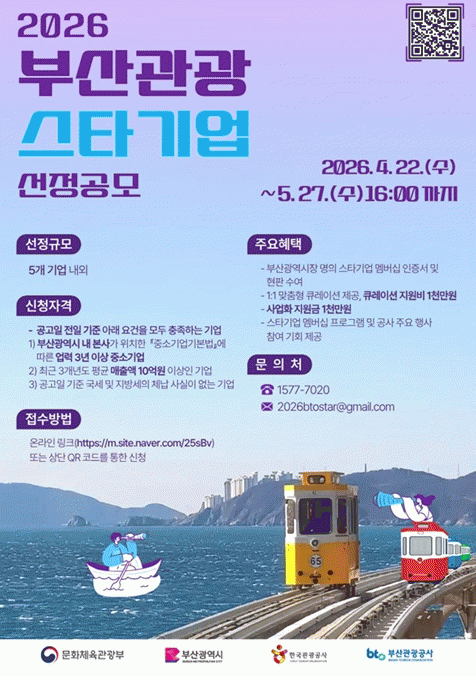 [´º½ºÅë °û¸íÈÆ ±âÀÚ] ºÎ»ê½Ã¿Í ºÎ»ê°ü±¤°ø»ç´Â ºÎ»ê°ü±¤±â¾÷Áö¿ø¼¾ÅͰ¡ ¿Ü±¹ÀÎ °ü±¤°´ 500¸¸ ½Ã´ë¸¦ ¼±µµÇÒ Áö¿ª °ü±¤»ê¾÷ÀÇ ÇÙ½É ÁÖ¿ªÀ» ¹ß±¼Çϱâ À§ÇØ '2026 ºÎ»ê°ü±¤ ½ºÅ¸±â¾÷ °ø¸ð'¸¦ ½Ç½ÃÇÑ´Ù°í ¹àÇû´Ù.