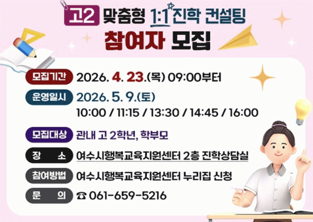 [´º½ºÅë ±è±¤¿ ±âÀÚ] ¿©¼ö½Ã´Â °ü³» °í2 Çлý°ú Çкθ𸦠À§ÇØ ¿À´Â 5¿ù 9ÀÏ Åä¿äÀÏ ¿©¼ö½ÃÇູ±³À°Áö¿ø¼¾ÅÍ¿¡¼ ¡®°í2 ¸ÂÃãÇü 1:1 ÁøÇÐ ÄÁ¼³ÆÃ¡¯À» ¿î¿µÇÑ´Ù°í ¹àÇû´Ù.