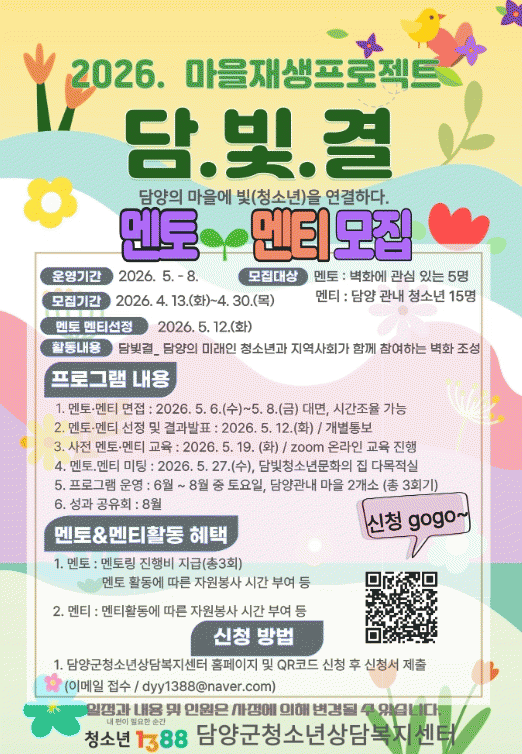 [´º½ºÅë ±è±¤¿ ±âÀÚ] ´ã¾ç±ºÃ»¼Ò³â»ó´ãº¹Áö¼¾ÅͰ¡ Áö¿ª û¼Ò³âÀÌ Á÷Á¢ Âü¿©ÇØ ¸¶À» ȯ°æÀ» °³¼±ÇÏ°í °øµ¿Ã¼ ÀǽÄÀ» ȸº¹ÇÏ´Â ¡®2026³â ¸¶À»Àç»ý»ç¾÷ ´ã¡¤ºû¡¤°á¡¯ÀÇ ¸àÅä¿Í ¸àƼ¸¦ ¿À´Â 30ÀϱîÁö ¸ðÁýÇÑ´Ù.