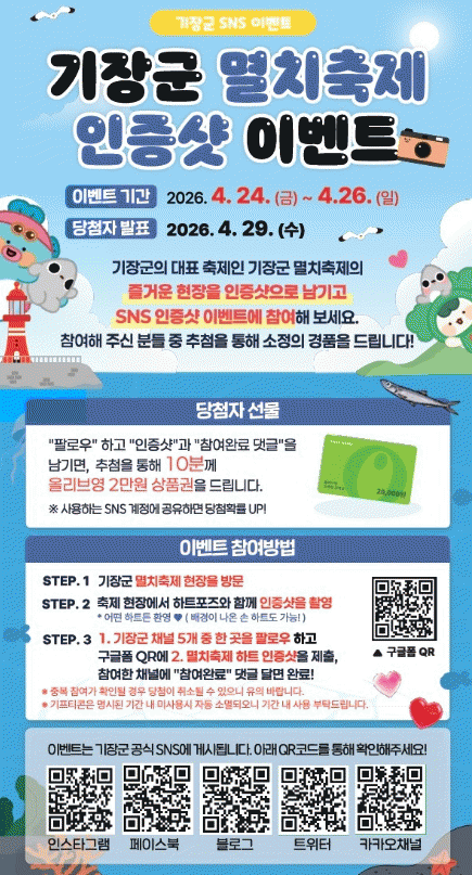 À̺¥Æ®´Â ÃàÁ¦ ±â°£ÀÎ 4¿ù 24ÀϺÎÅÍ 26ÀϱîÁö 3Àϰ£ ÁøÇàµÈ´Ù. Âü¿©¸¦ ¿øÇÏ´Â ¹æ¹®°´Àº ÃàÁ¦ ÇöÀå¿¡¼ ÇÏÆ® Æ÷Áî·Î ÀÎÁõ¼¦À» ÃÔ¿µÇÑ µÚ, ±âÀ屺 °ø½Ä SNS(ÆäÀ̽ººÏ, ÀνºÅ¸±×·¥, ºí·Î±×, À¯Æ©ºê, īī¿ÀÅåä³Î) Áß 1°÷ ÀÌ»óÀ» ÆÈ·Î¿ìÇÏ¸é µÈ´Ù. ÀÌÈÄ ¾È³»µÈ QR Äڵ带 ÅëÇØ »çÁøÀ» Á¦ÃâÇϰí À̺¥Æ® °Ô½Ã¹°¿¡ ¡®Âü¿© ¿Ï·á¡¯ ´ñ±ÛÀ» ³²±â¸é Á¢¼ö°¡ ¿Ï·áµÈ´Ù.