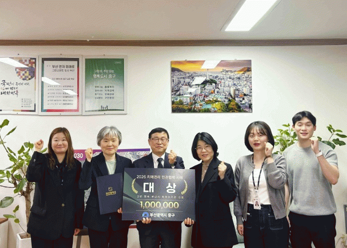 [´º½ºÅë °û¸íÈÆ ±âÀÚ]ºÎ»ê Áß±¸´Â 2026³â Ä¡¸Å°ü¸® ¹Î°üÇù·Â ¿ì¼ö»ç·Ê °ø¸ðÀü¿¡¼¡®¼ÒÁö¿ª ¸ÂÃãÇü ±â¾ïµ¿Çà, Áß±¸Çü Ä¡¸Åº¸µë¸¶À»¡¯»ç·Ê·Î ´ë»óÀ» ¼ö»óÇß´Ù°í ¹àÇû´Ù.
