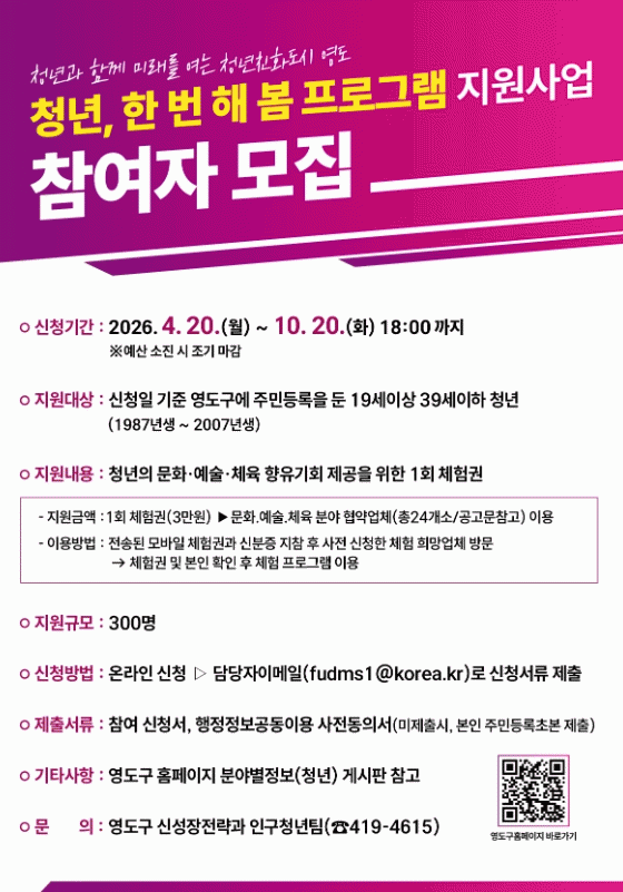 [´º½ºÅë °û¸íÈÆ ±âÀÚ]ºÎ»ê ¿µµµ±¸´Â û³âµé¿¡°Ô ¹®È ÇâÀ¯ ±âȸ¸¦ Á¦°øÇϰí Áö¿ª û³â¹®È Ȱ¼ºÈ¸¦ µµ¸ðÇϱâ À§ÇØ 'û³â, ÇÑ ¹ø ÇØ º½ ÇÁ·Î±×·¥ Áö¿ø»ç¾÷' Âü¿©ÀÚ¸¦ ÀÌ´Þ 20ÀϺÎÅÍ 10¿ù 20ÀϱîÁö ¸ðÁýÇÑ´Ù°í ¹àÇû´Ù.