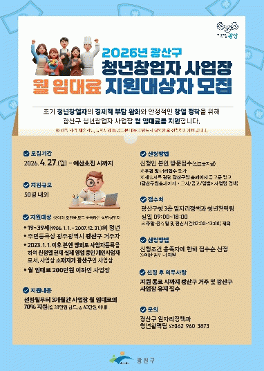 [´º½ºÅë ±è±¤¿ ±âÀÚ]±¤ÁÖ ±¤»ê±¸°¡ â¾÷ÇÑ Ã»³âÀÇ °æÁ¦Àû ºÎ´ãÀ» ´ú°í, ¾ÈÁ¤Àû Á¤ÂøÀ» µ½´Â ¡®2026³â ±¤»ê±¸ û³â â¾÷ÀÚ »ç¾÷Àå ¿ù ÀÓ´ë·á Áö¿ø»ç¾÷¡¯À» ÃßÁøÇÑ´Ù.