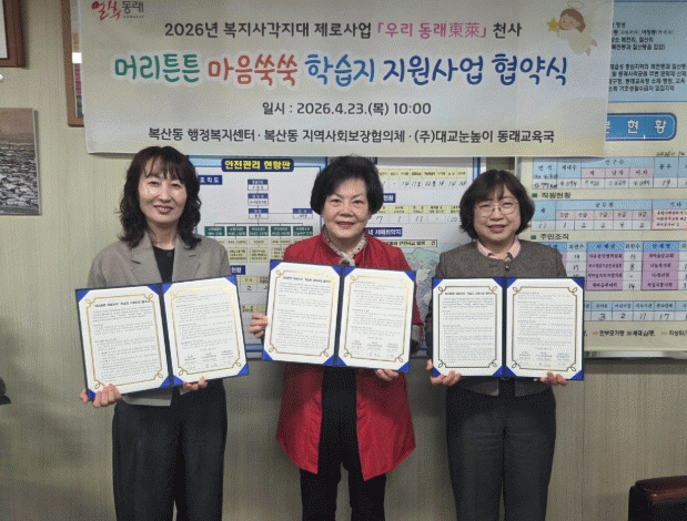 [´º½ºÅë °û¸íÈÆ ±âÀÚ] ºÎ»ê µ¿·¡±¸ º¹»êµ¿ ÇàÁ¤º¹Áö¼¾ÅÍ´Â Áö³ 23ÀÏ º¹»êµ¿Áö¿ª»çȸº¸ÀåÇùÀÇü, (ÁÖ)´ë±³´«³ôÀÌ ºÎ»êµ¿·¡±³À°±¹°ú ¡®¸Ó¸®Æ°Æ° ¸¶À½¾¦¾¦' ÇнÀÁö Áö¿ø»ç¾÷ ÃßÁøÀ» À§ÇÑ Çù¾àÀ» ü°áÇß´Ù°í ¹àÇû´Ù.