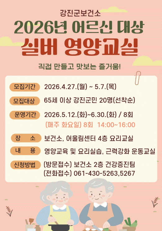 À̹ø ÇÁ·Î±×·¥Àº °í·ÉÃþÀÇ ¸¸¼ºÁúȯ ¿¹¹æ°ú ¿Ã¹Ù¸¥ ½Ä»ýȰ °ü¸®ÀÇ Á߿伺ÀÌ °Á¶µÊ¿¡ µû¶ó ¸¶·ÃµÆÀ¸¸ç, 5¿ù 12ÀϺÎÅÍ 6¿ù 30ÀϱîÁö ¸ÅÁÖ È¿äÀÏ ¿ÀÈÄ 2½ÃºÎÅÍ 4½Ã±îÁö ÃÑ 8ȸ¿¡ °ÉÃÄ ÁøÇàµÈ´Ù.