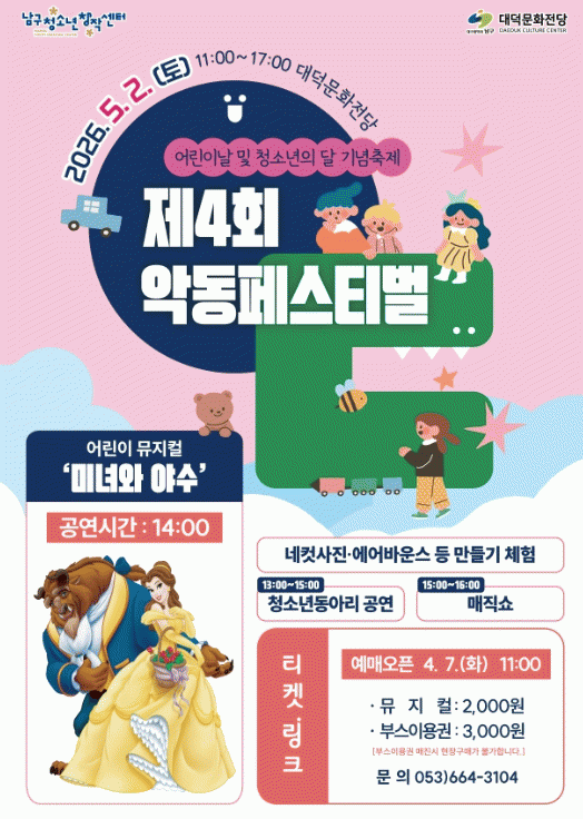 [´º½ºÅë ¾È»óµ· ±âÀÚ] ´ë±¸ ³²±¸Ã»¼Ò³ââÀÛ¼¾ÅÍ´Â 5¿ù ¾î¸°À̳¯ ¹× û¼Ò³âÀÇ ´ÞÀ» ¸Â¾Æ ¿À´Â 5¿ù 2ÀÏ Åä¿äÀÏ ´ë´ö¹®ÈÀü´ç¿¡¼ 'Á¦4ȸ ¾Çµ¿Æä½ºÆ¼¹ú'À» °³ÃÖÇÑ´Ù°í ¹àÇû´Ù.