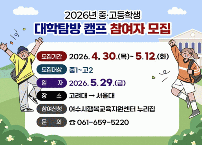 ¿©¼ö½ÃÇູ±³À°Áö¿ø¼¾ÅÍ, ¡®2026³â Áß¡¤°íµîÇлý ´ëÇРŽ¹æ Ä·ÇÁ¡¯ Âü¿©ÀÚ ¸ðÁý